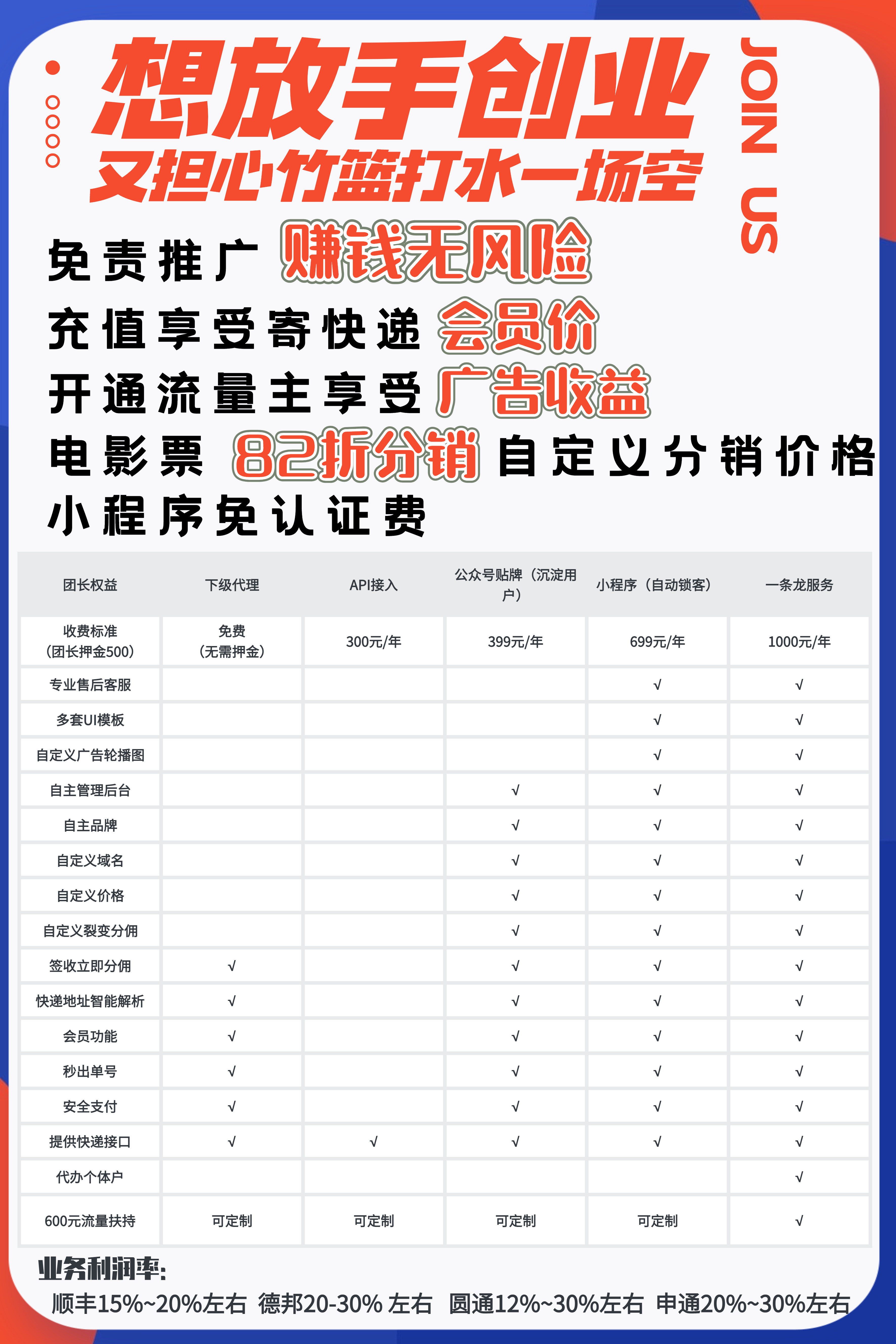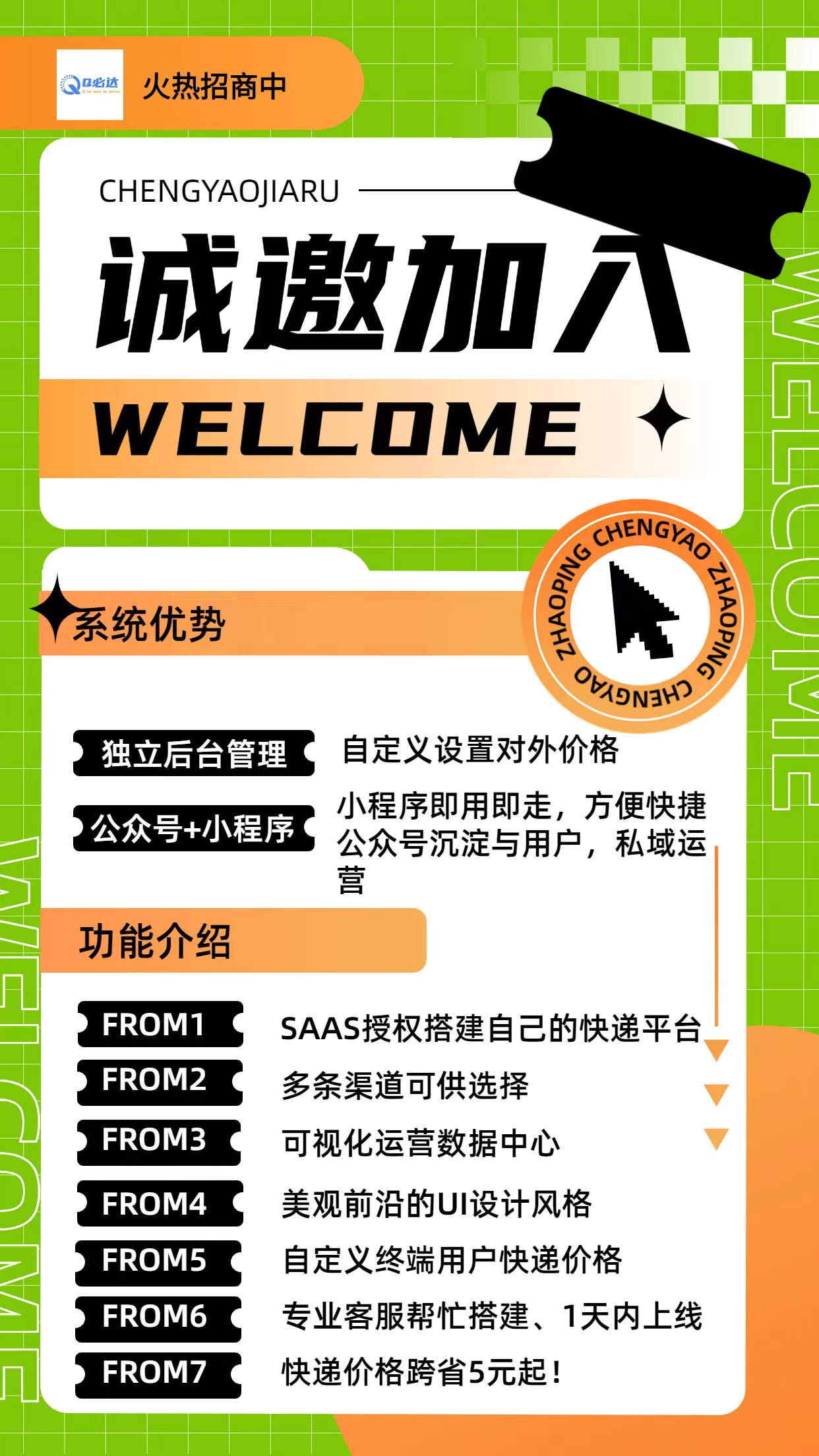 诚邀入驻代理!快递独立分销系统 我们为广大消费者提供市面上最优惠的快递服务,凭借着实惠的价格和优质的服务,吸引了非常多的消费者使用,为了扩大推广,现震撼推出商户模式,这是一种全新的推广模式,诚邀代理入