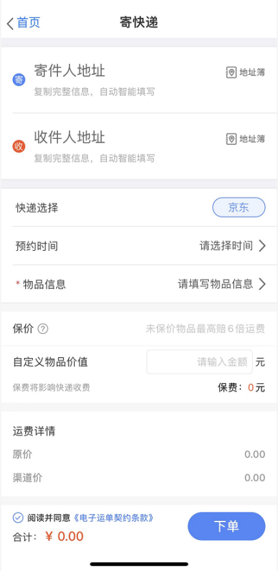 2. 填写正确寄件人和收件人,填写相对应的快递信息,如需保价则填写物品价值进行保价。确认无误后完成下单。