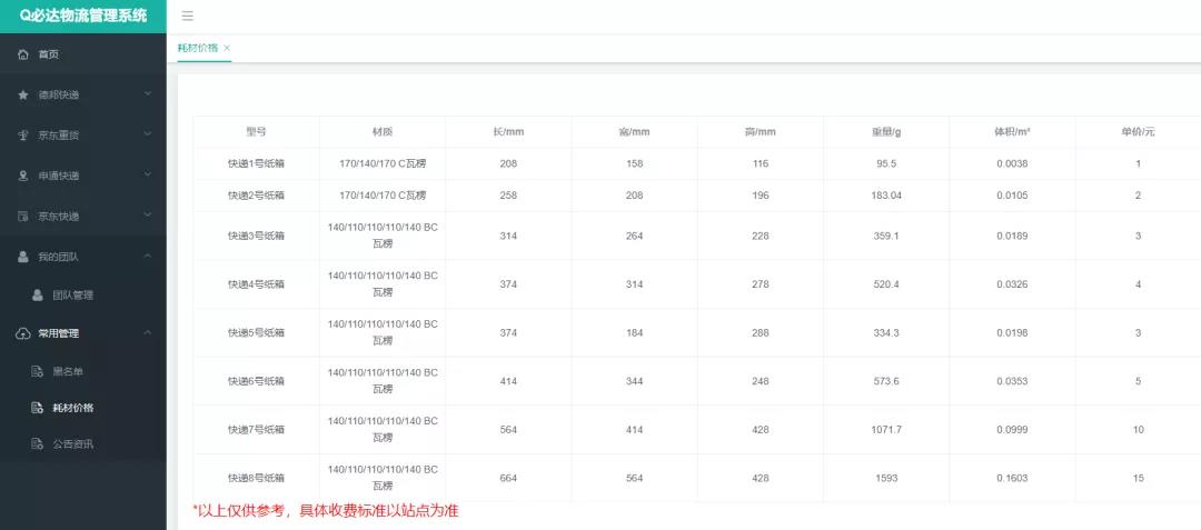 快递纸箱价格表,仅供参考,实际以站点收费为主。